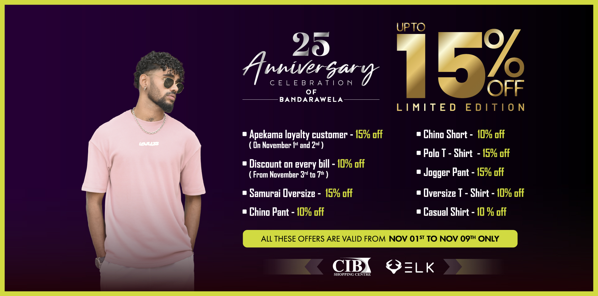 In the spirit of celebrating the 25th anniversary of CIB Shopping Centre - Bandarawela Branch, we are giving our loyal customers from Bandarawela, discounts upto 15% on all ELK branded products.