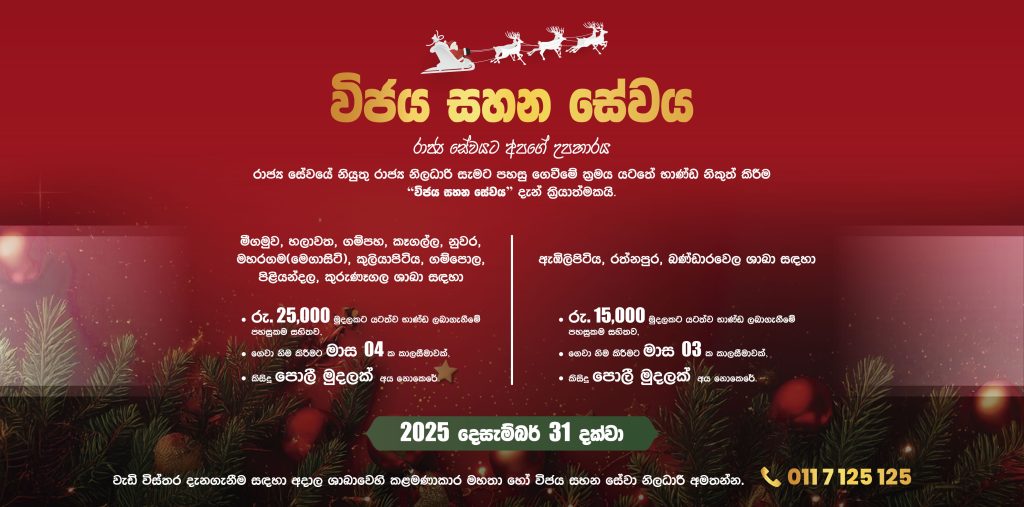 රාජ්ය සේවයේ නියුතු රාජ්ය නිලධාරි සැමට පහසු ගෙවීමේ ක්රමය යටතේ භාණ්ඩ නිකුත් කිරීම "විජය සහන සේවය" දැන් ක්රියාත්මකයි.