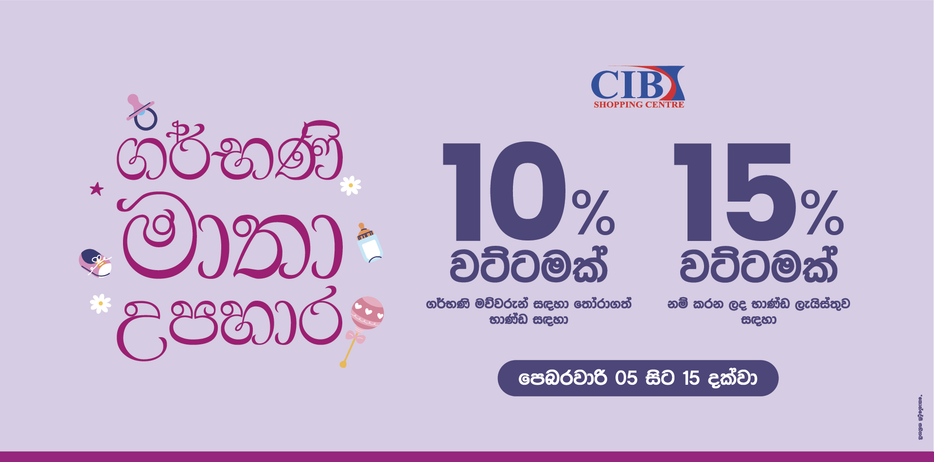 ගර්භණී මව්වරුන් වෙනුවෙන් තෝරාගත් භාණ්ඩ සඳහා, 10% ක වට්ටමක් සහ නම් කරන ලද භාණ්ඩ ලැයිස්තුව සඳහා 15% ක වට්ටමක් ද,