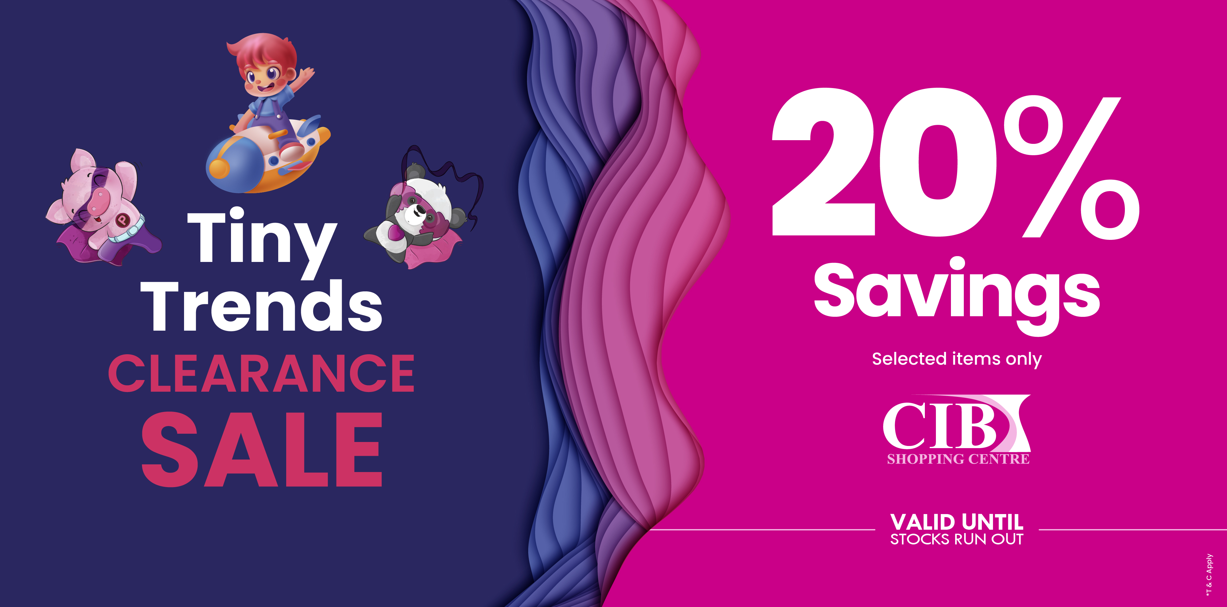 Get ready to save big! The Tiny Trends Clearance Sale is on now at CIB Shopping Centre. Enjoy 20% Savings on selected items. Don't wait—this massive sale is valid until stocks run out! Shop all the must-have trends for tiny tots before they're gone.
